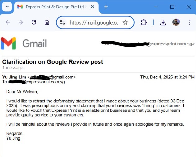 Today (03 Dec 2025), we received an unmerited 1-star review on our Google page from a user named Yu Jing Lim (see review here). Reviews like this can have a serious impact on our reputation, especially when the claims made are not true. In the interest of full transparency, we are sharing both the review and our response publicly.