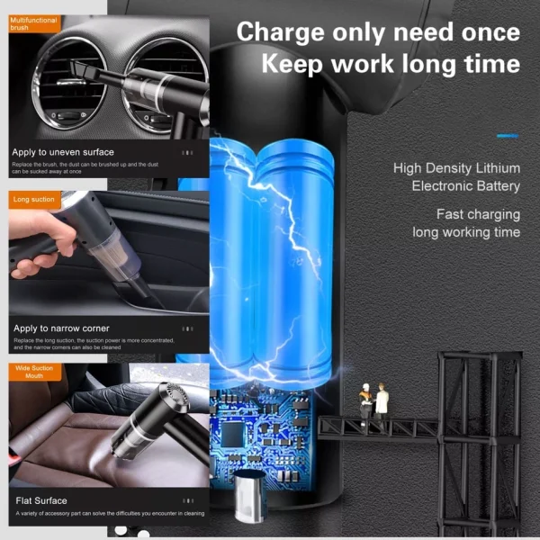 It is equipped with a 2000MAH rechargeable lithium battery that takes only 3-4 hours to fully charge and maintains a super clean time for more than 20 minutes.(Cannot continue to use for MORE THAN 30 MINUTES, otherwise it will BURN OUT the motor easily.)⚠NOTE: When charging the vacuum cleaner, you must keep the vacuum cleaner switch off.
